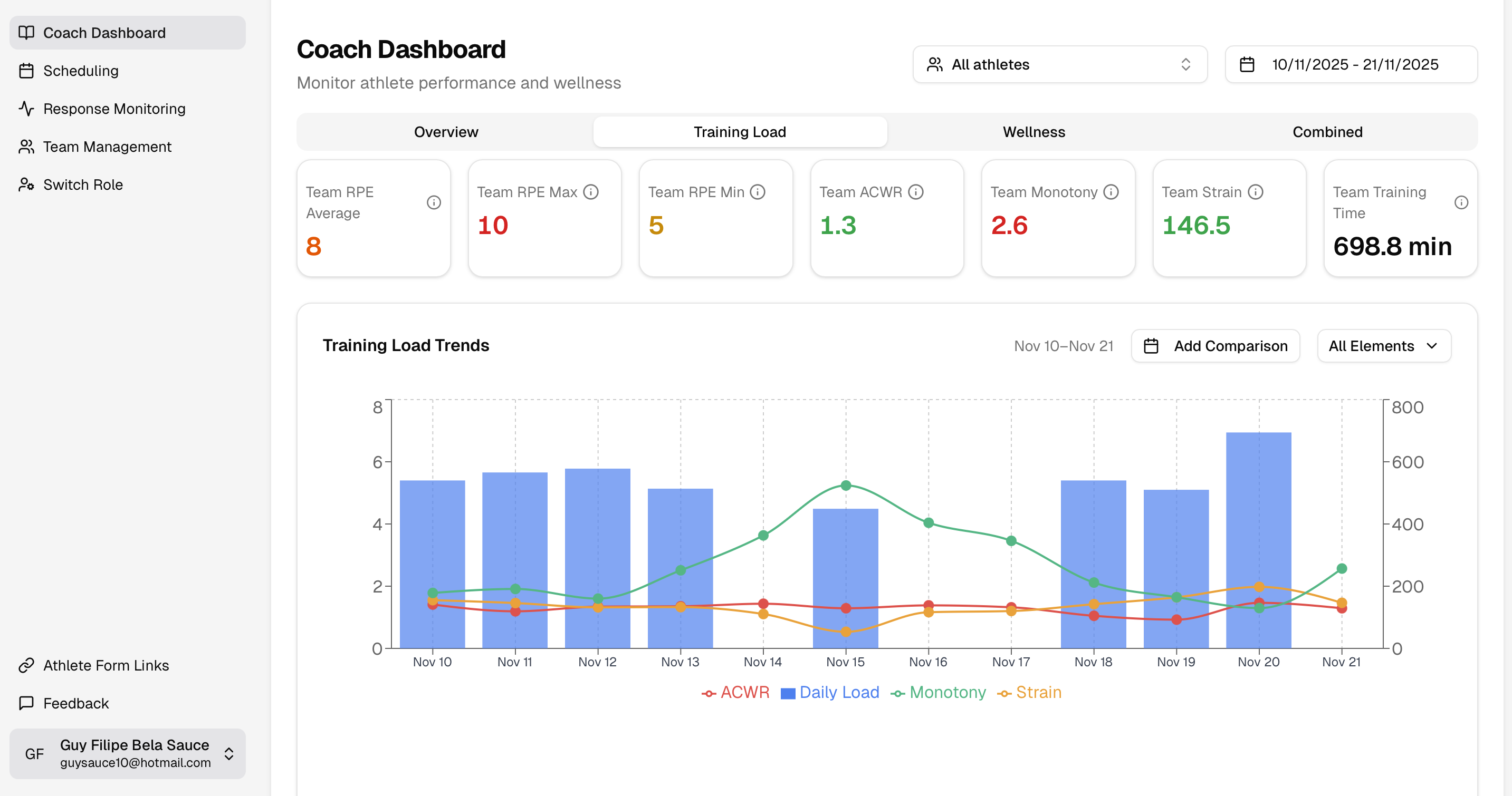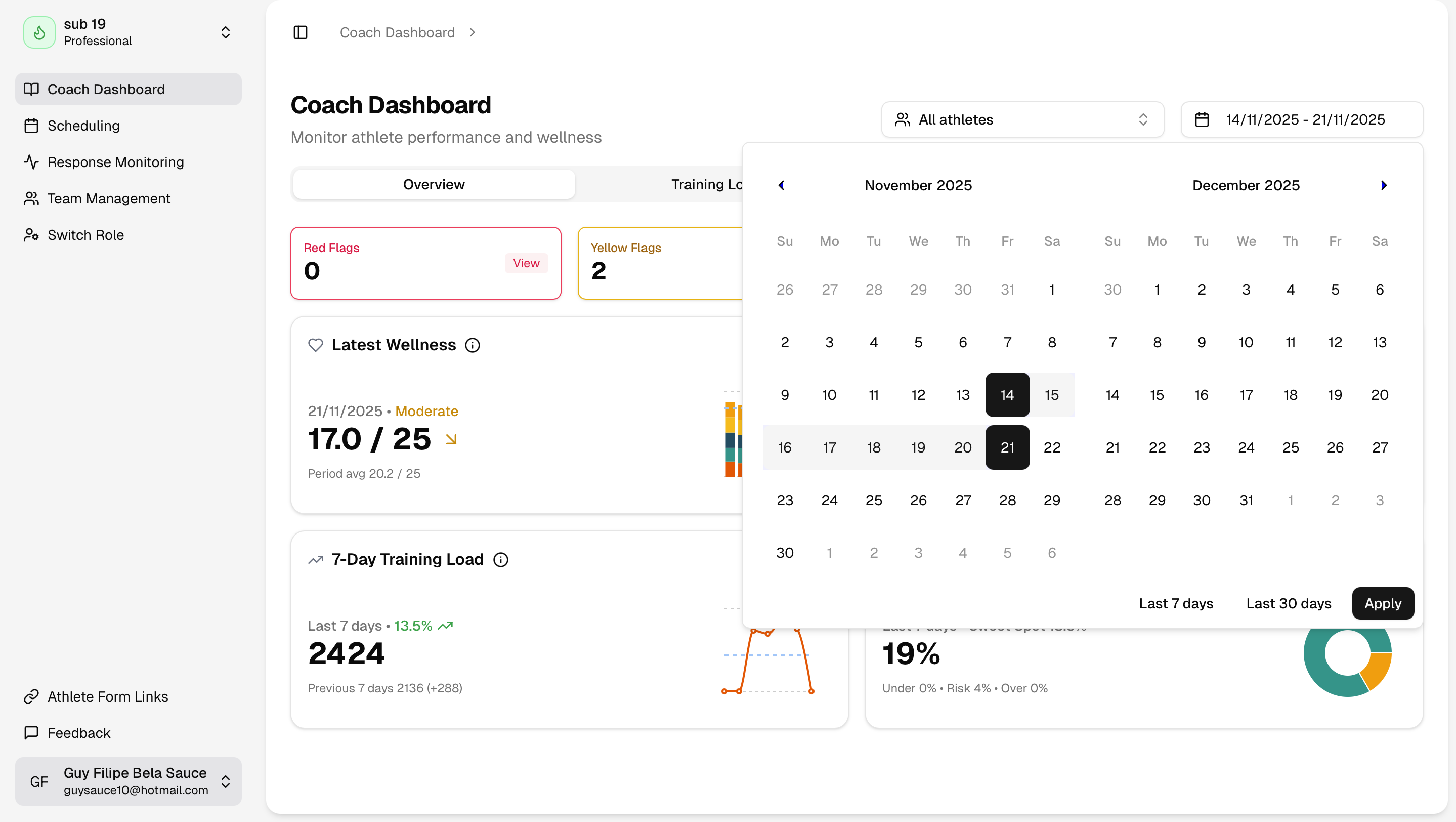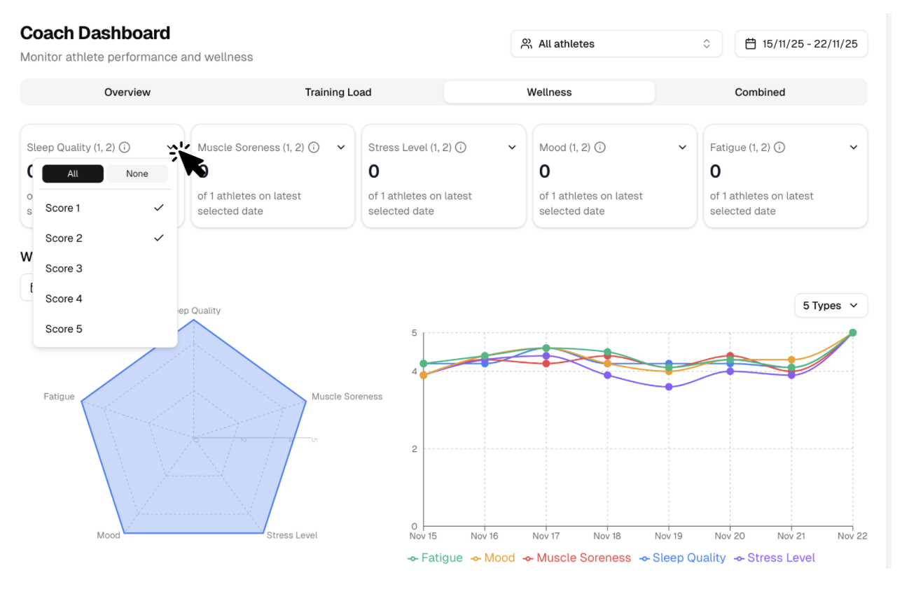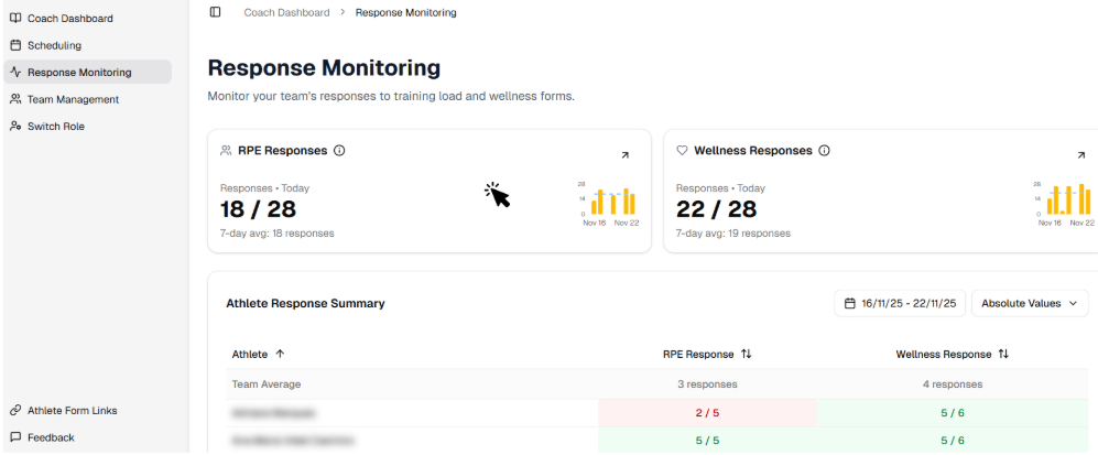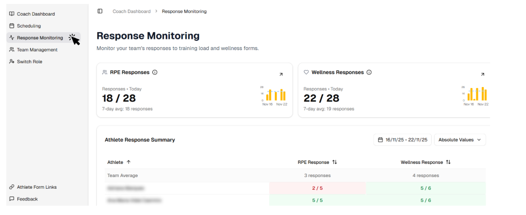 In the Response Monitoring page you will be able to analyse the volume of responses to the RPE & Wellness questionnaires.