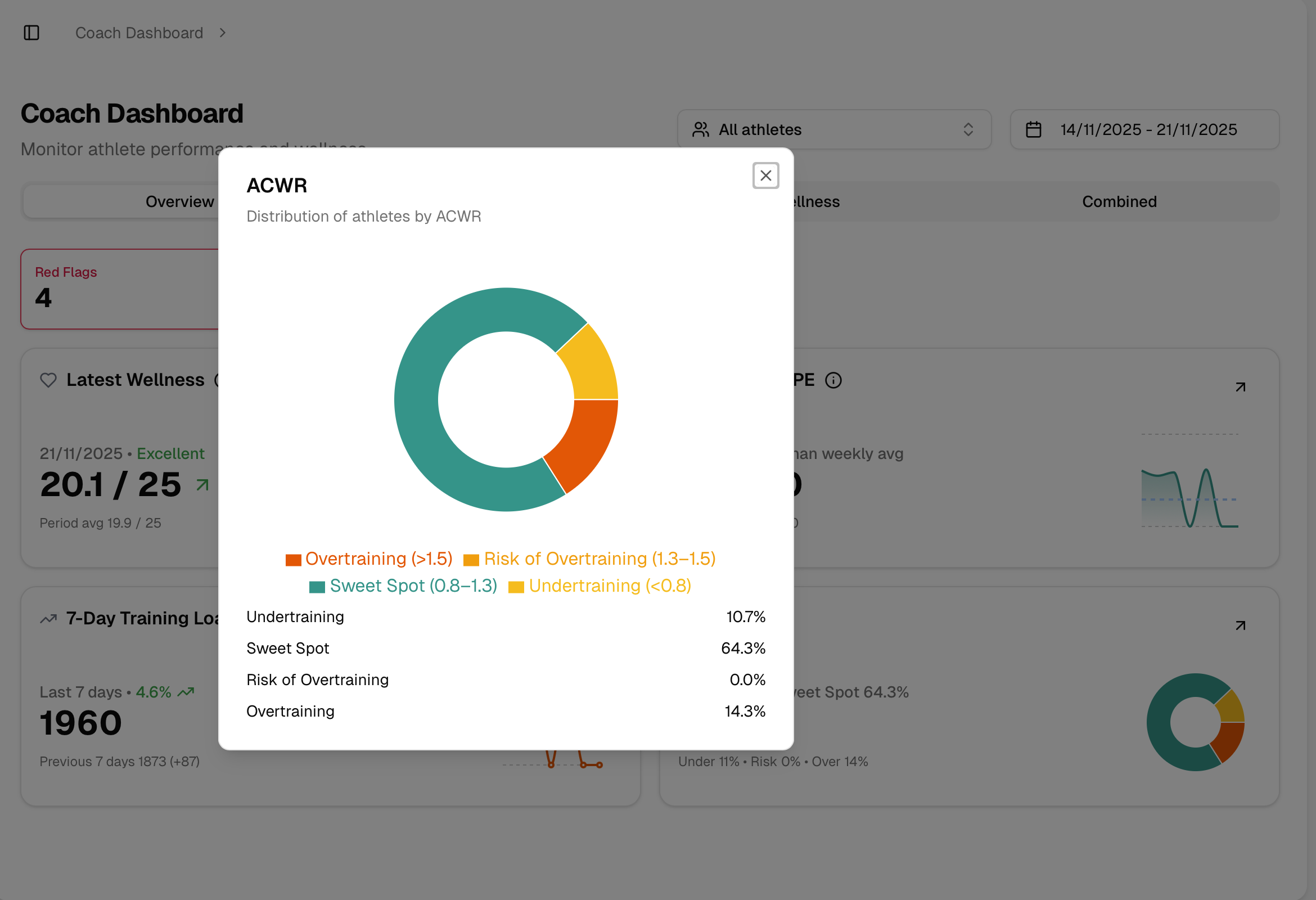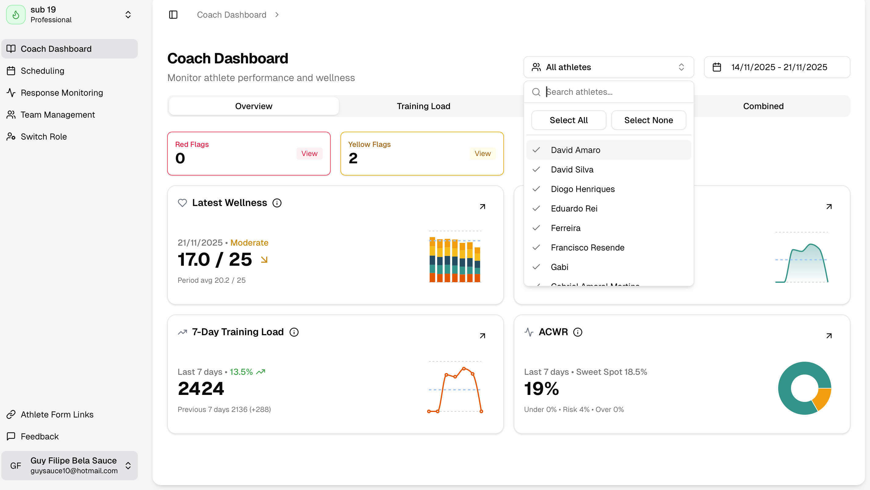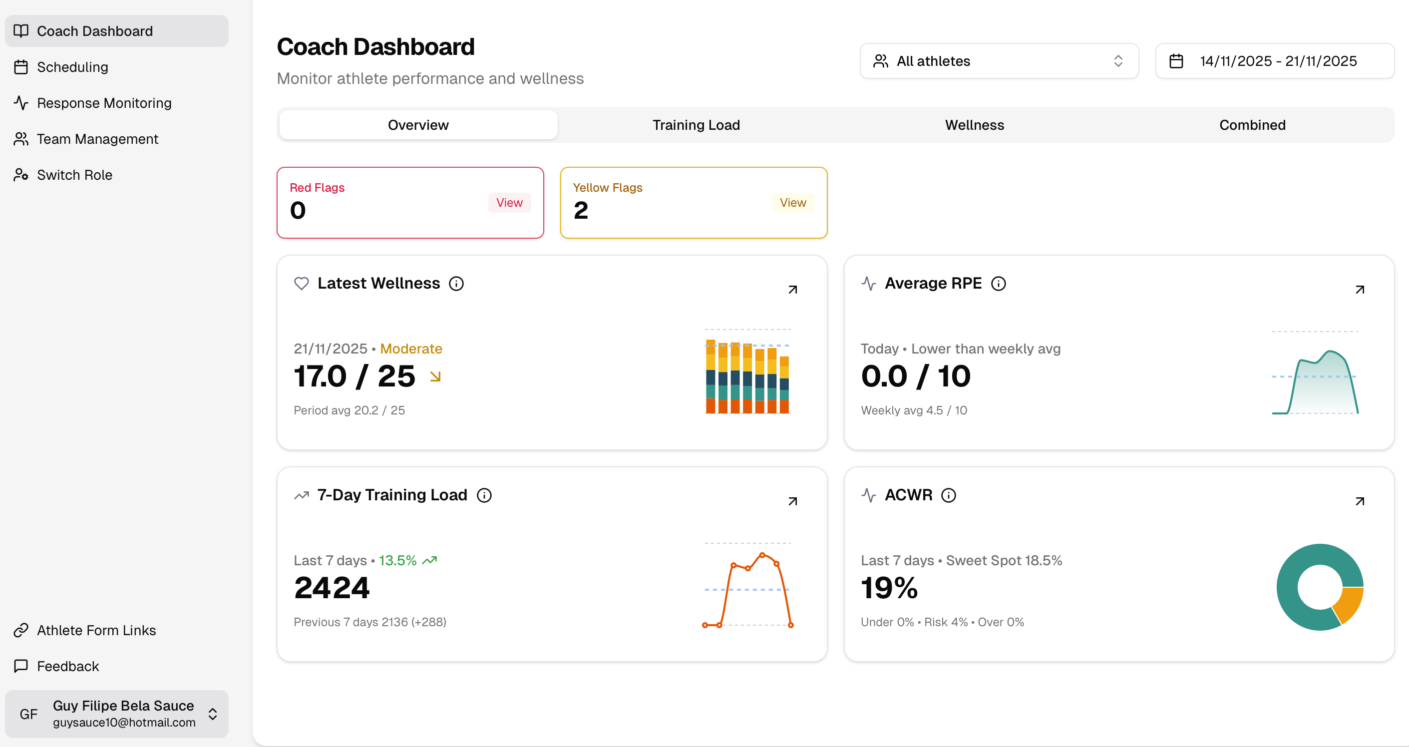 In the Response Monitoring page you will be able to analyse the volume of responses to the RPE & Wellness questionnaires.