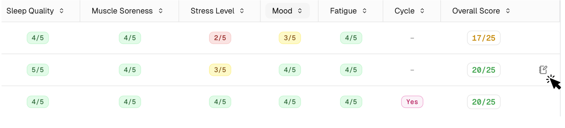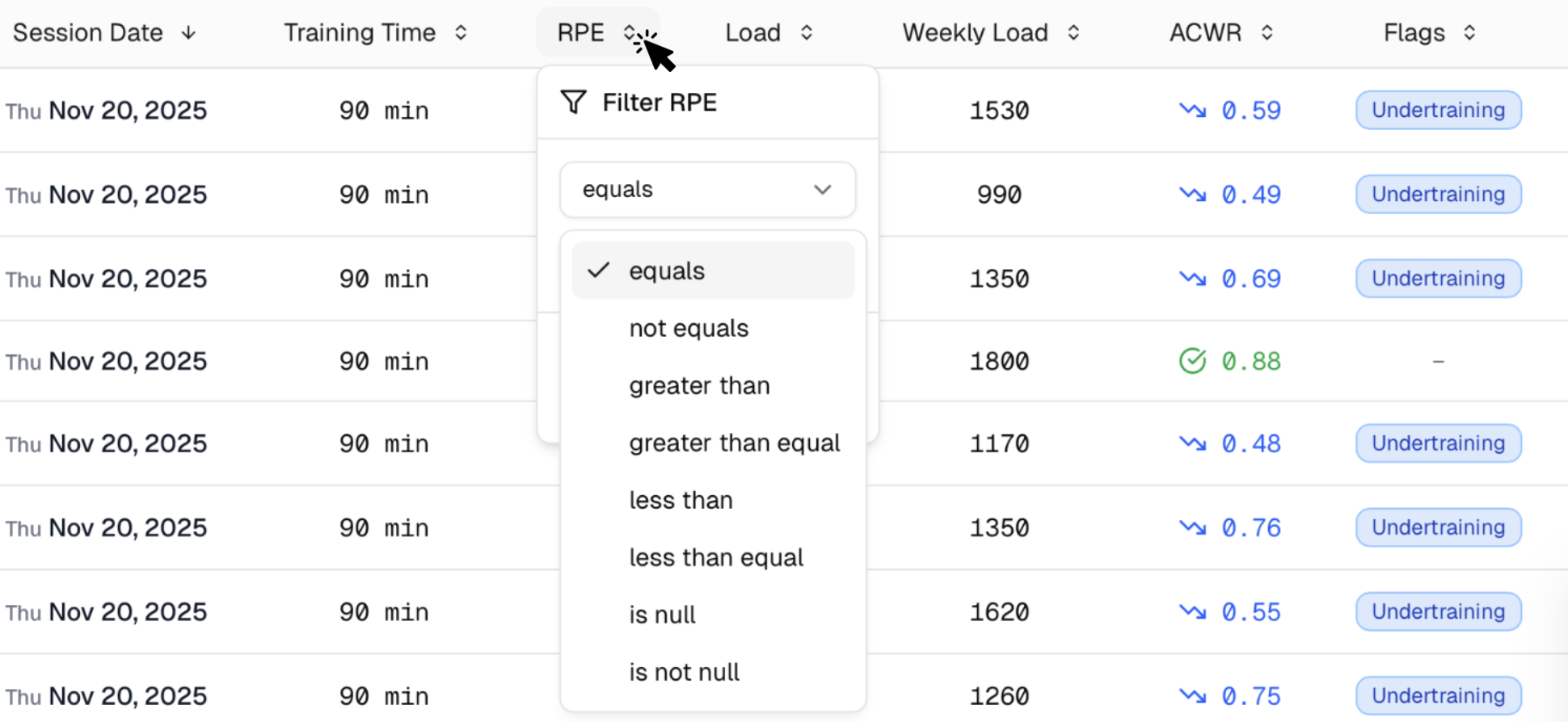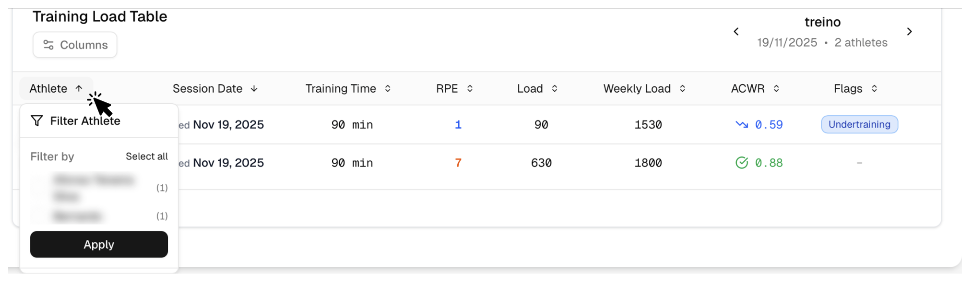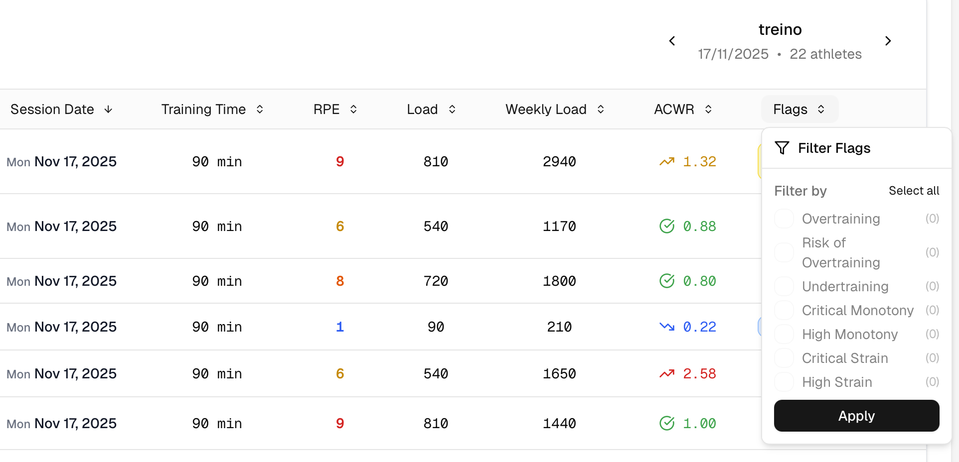 - Click the RPE cell in the table to edit a value or add a value to a empty cell. You can also add notes to the training session of each athlete - these will only be visible to you