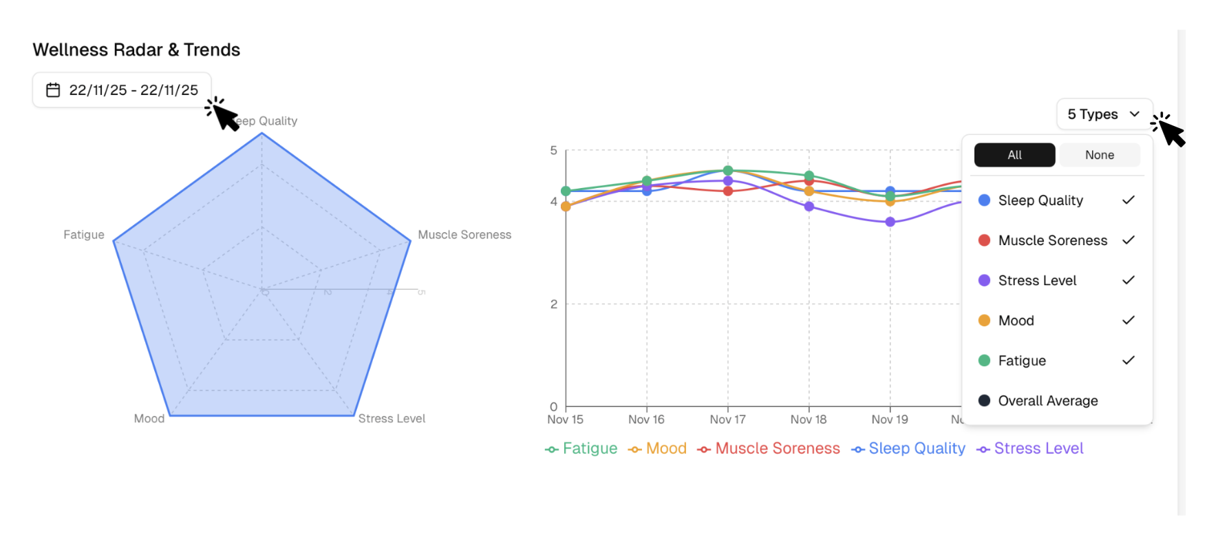 - Click the date range above the radar chart to select the period you want to view. Select which wellness metrics you want to display