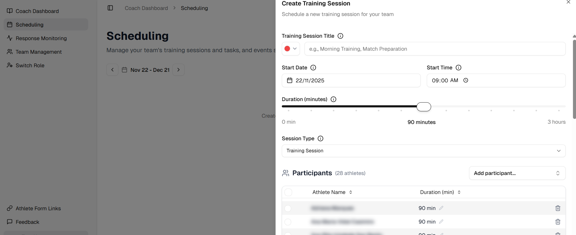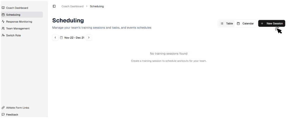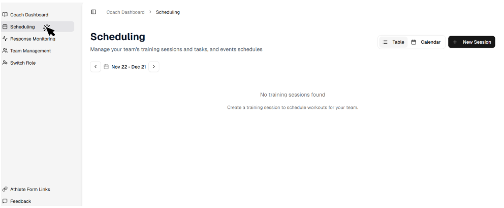 In the Scheduling page you can create the sessions that athletes will have (training sessions / match day).