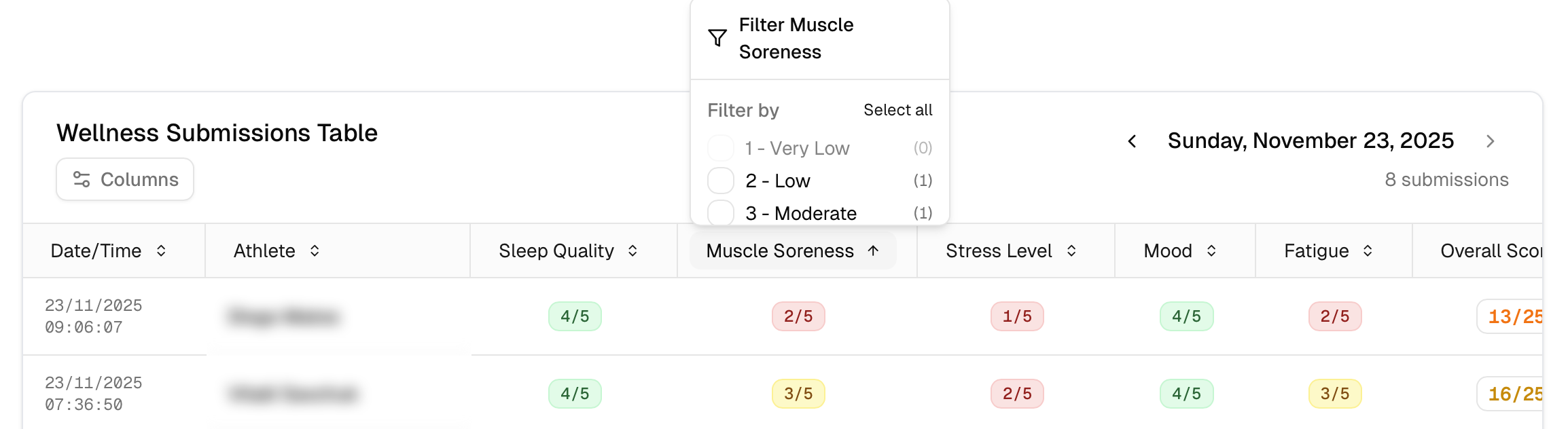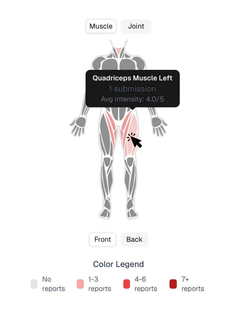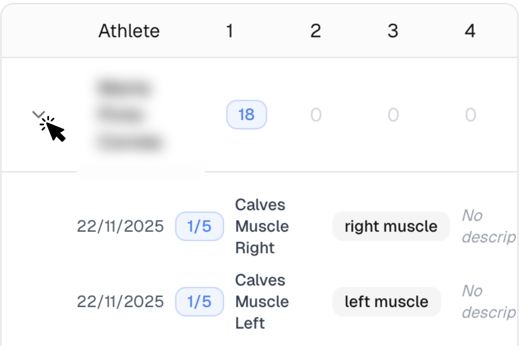 - Click the arrow next to the athlete name to see which muscles/joints where reported