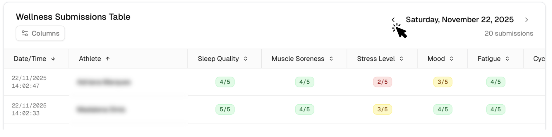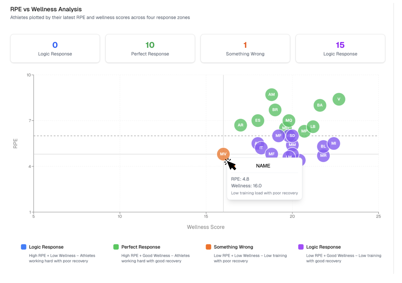 The pages show the aggregated results for the team, and also a detailed view for each athlete. By clicking each card you will be able to manage individual responses.