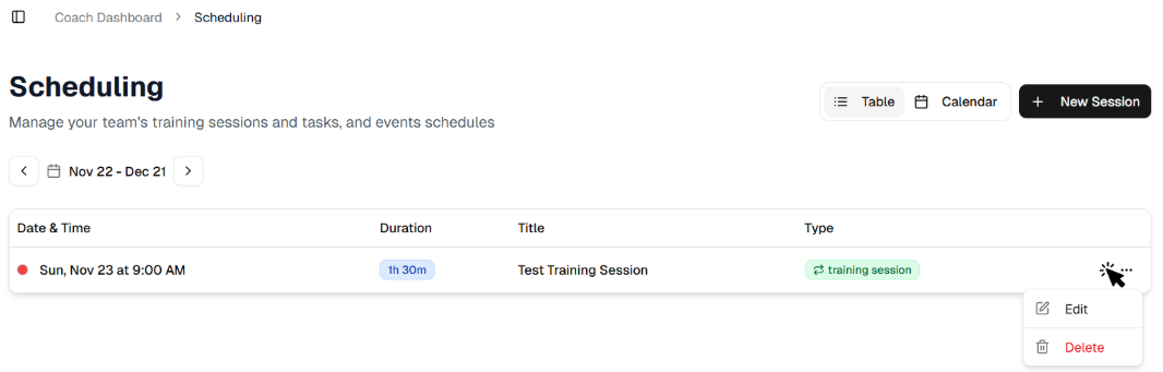 - You can manage the training sessions in the Scheduling page