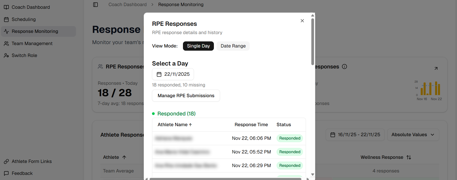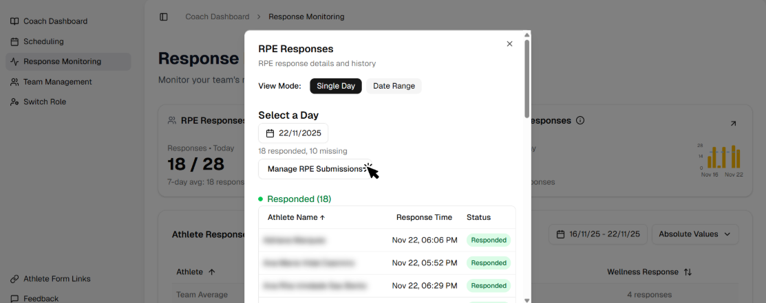 - If you click the RPE Responses Card you will open a Dialog box where you can see which athlete responded or not, and manage the responses the responses of each athlete